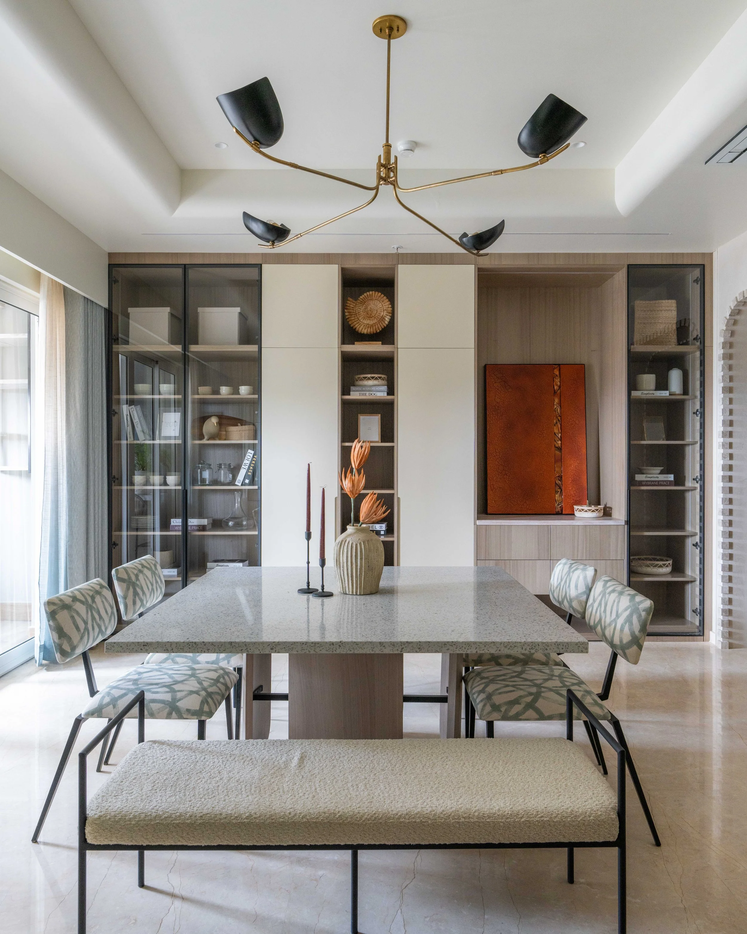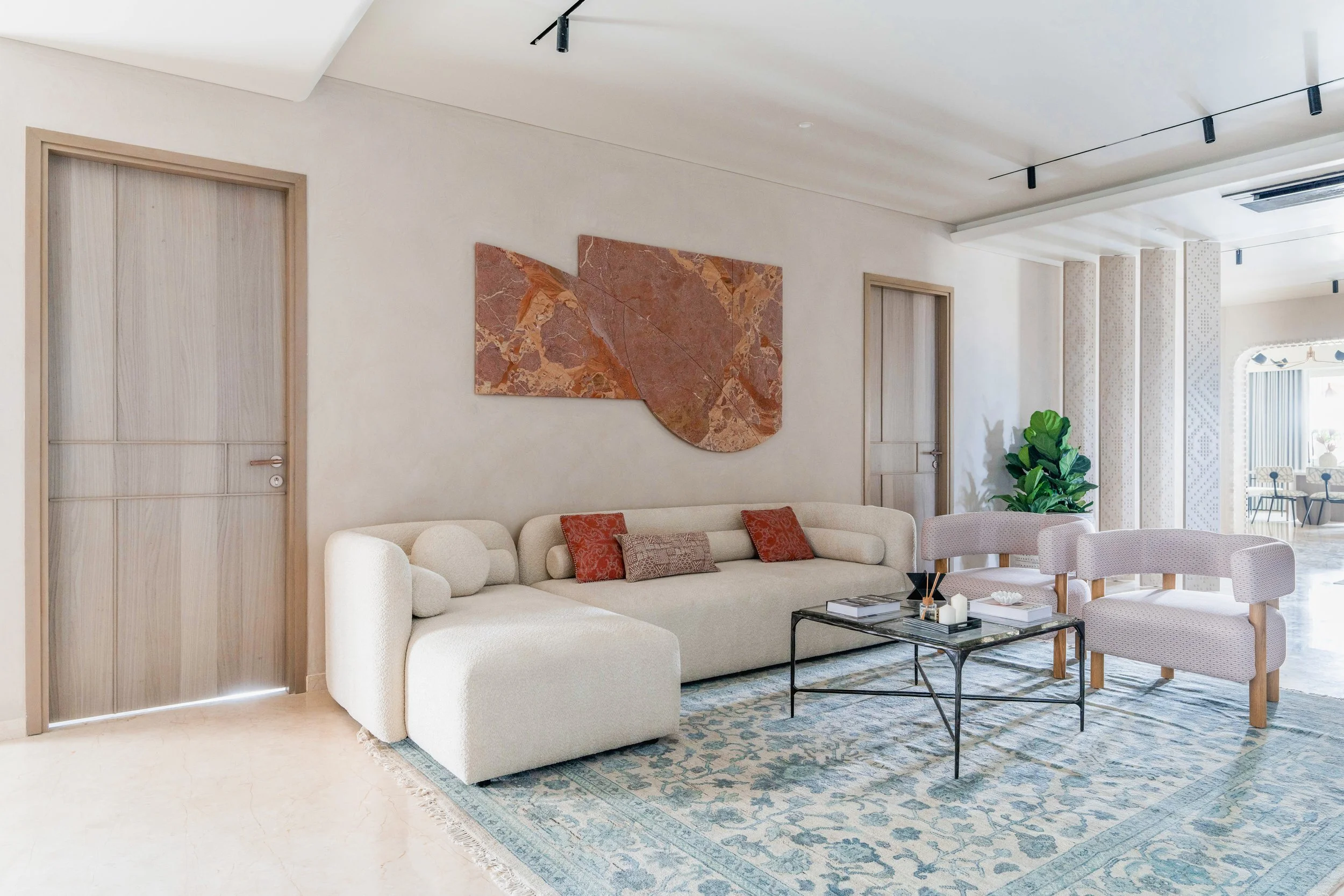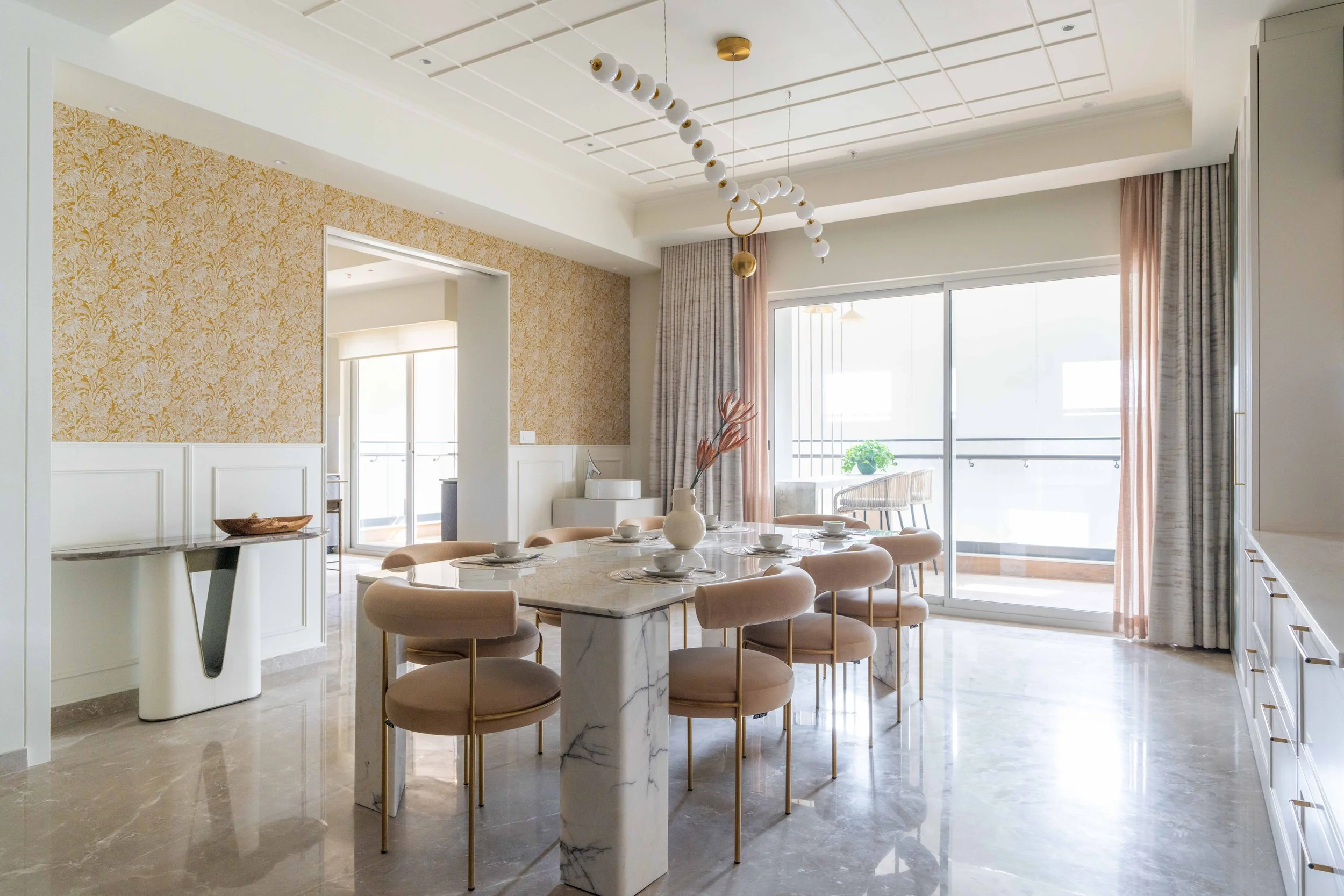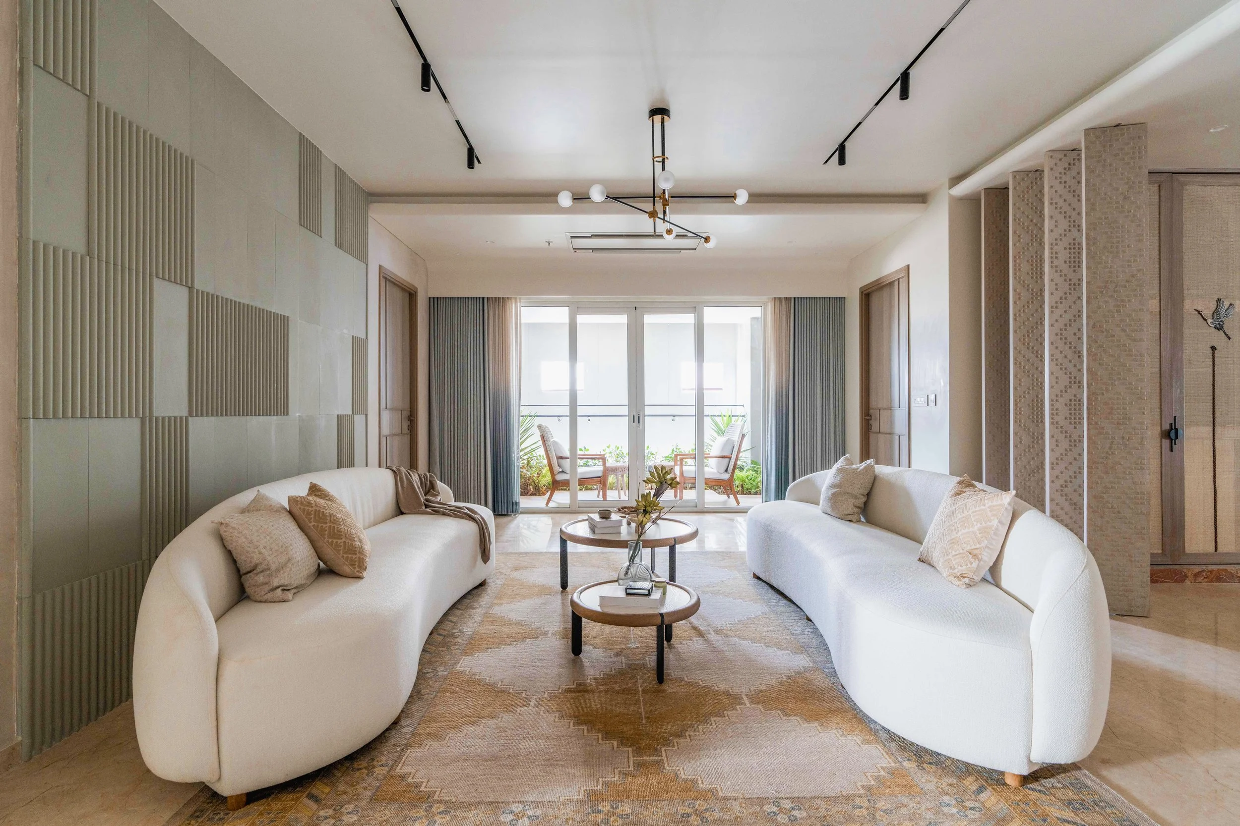 Eternal Glow, as we call it, is a luxury project that comprises two model apartments we designed for Aurobindo Pearl. Rooted in timelessness, much like the pearl itself, the design incorporates elements from different styles and eras, adding visual interest to every space and creating moments of connection for all kinds of visitors. While both apartments are designed to be visually cohesive, each has its own unique take on quiet luxury.