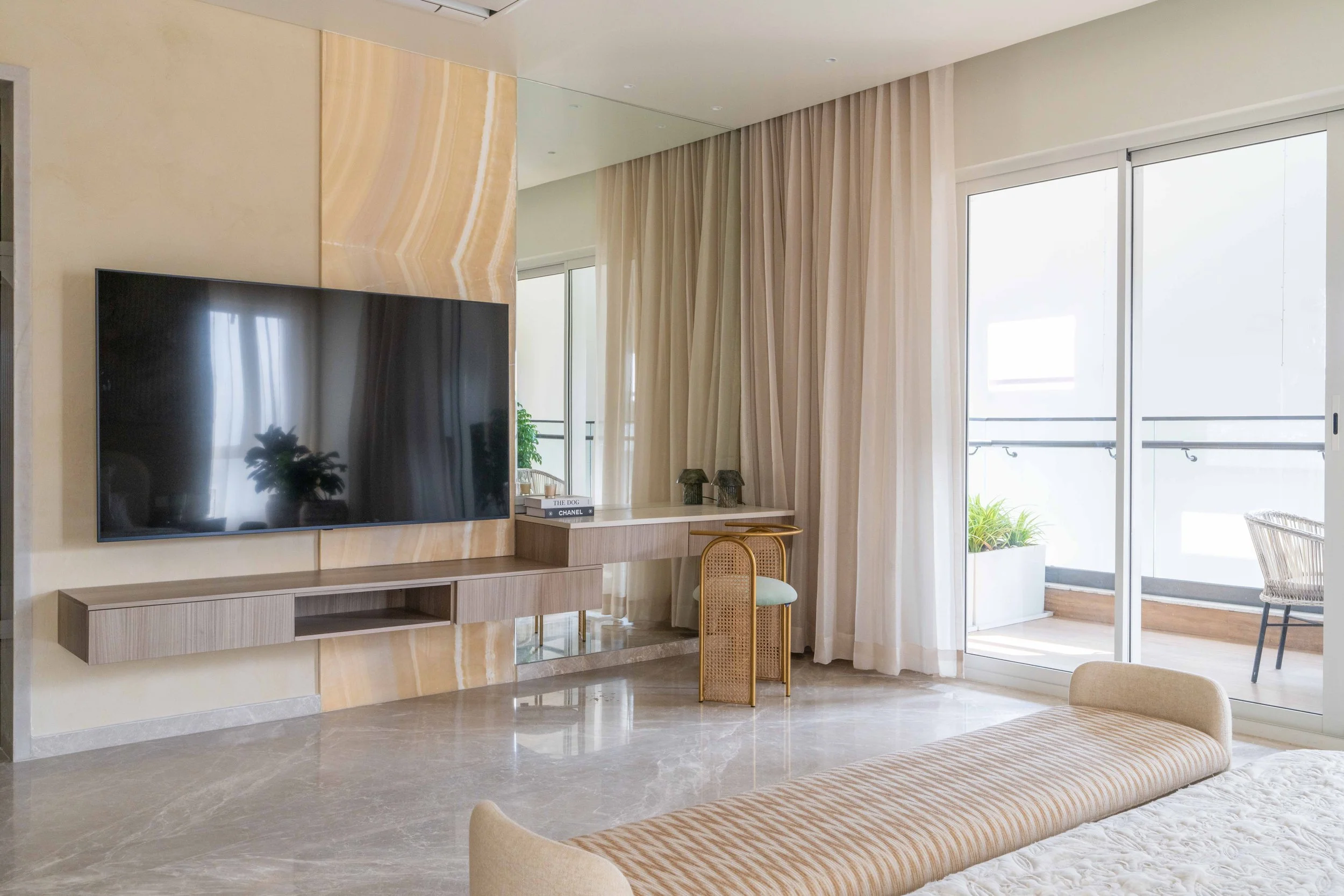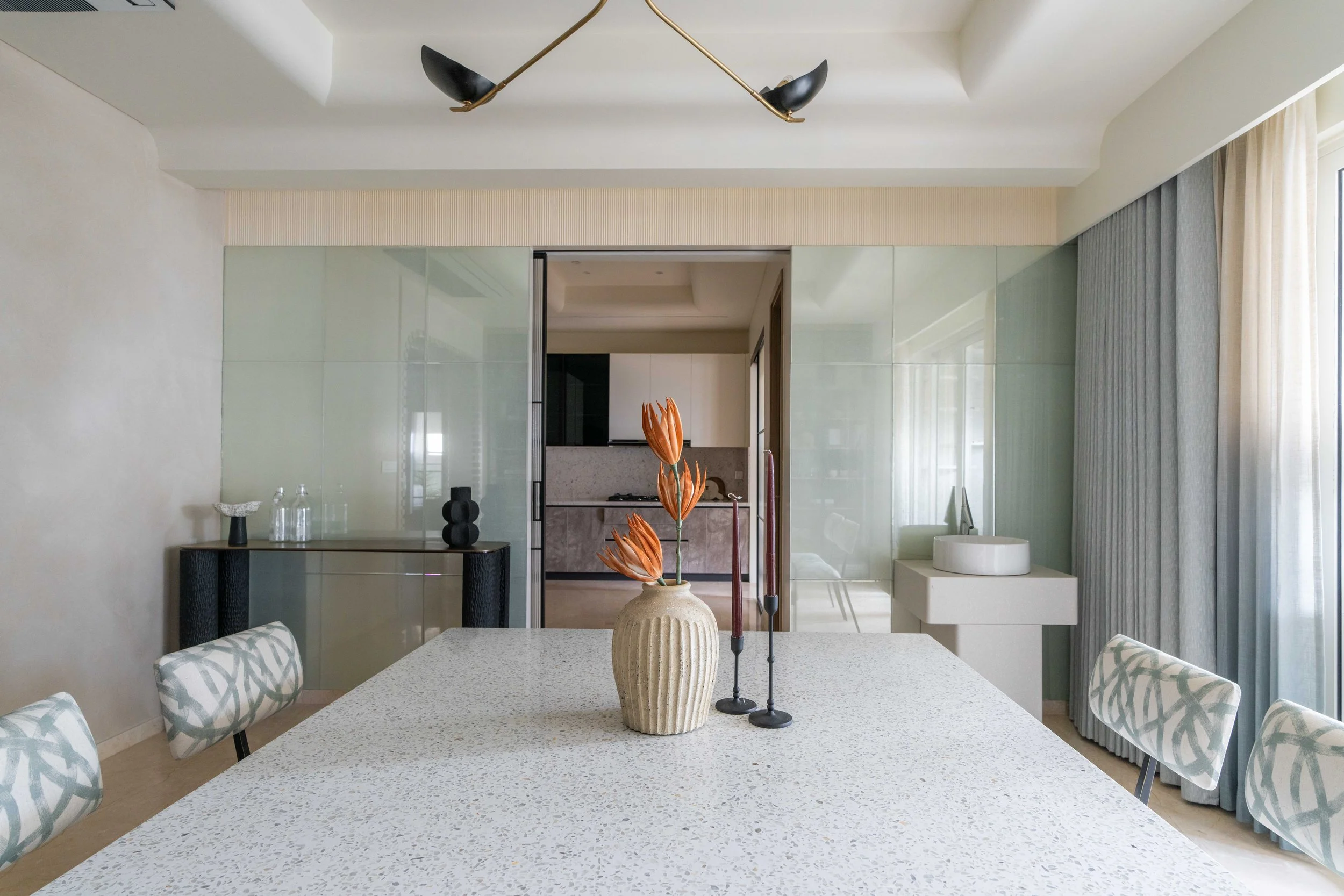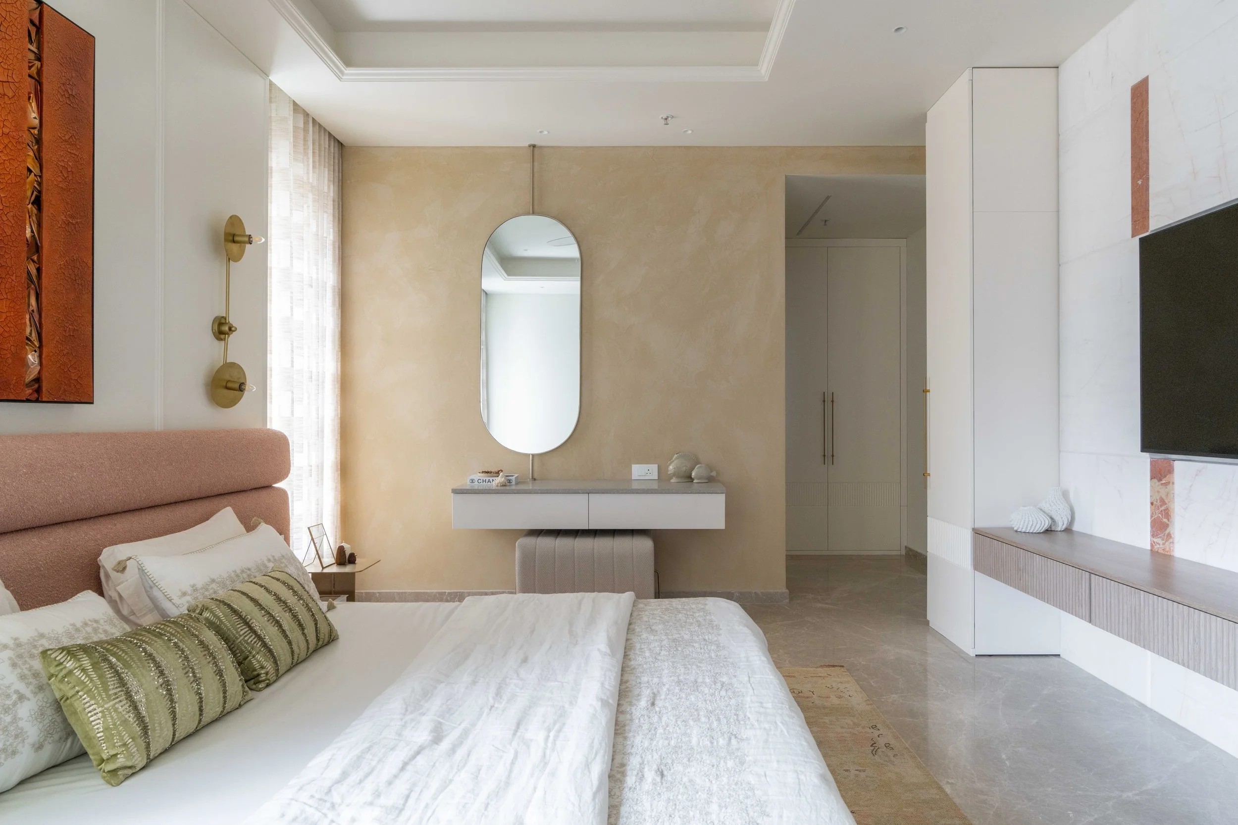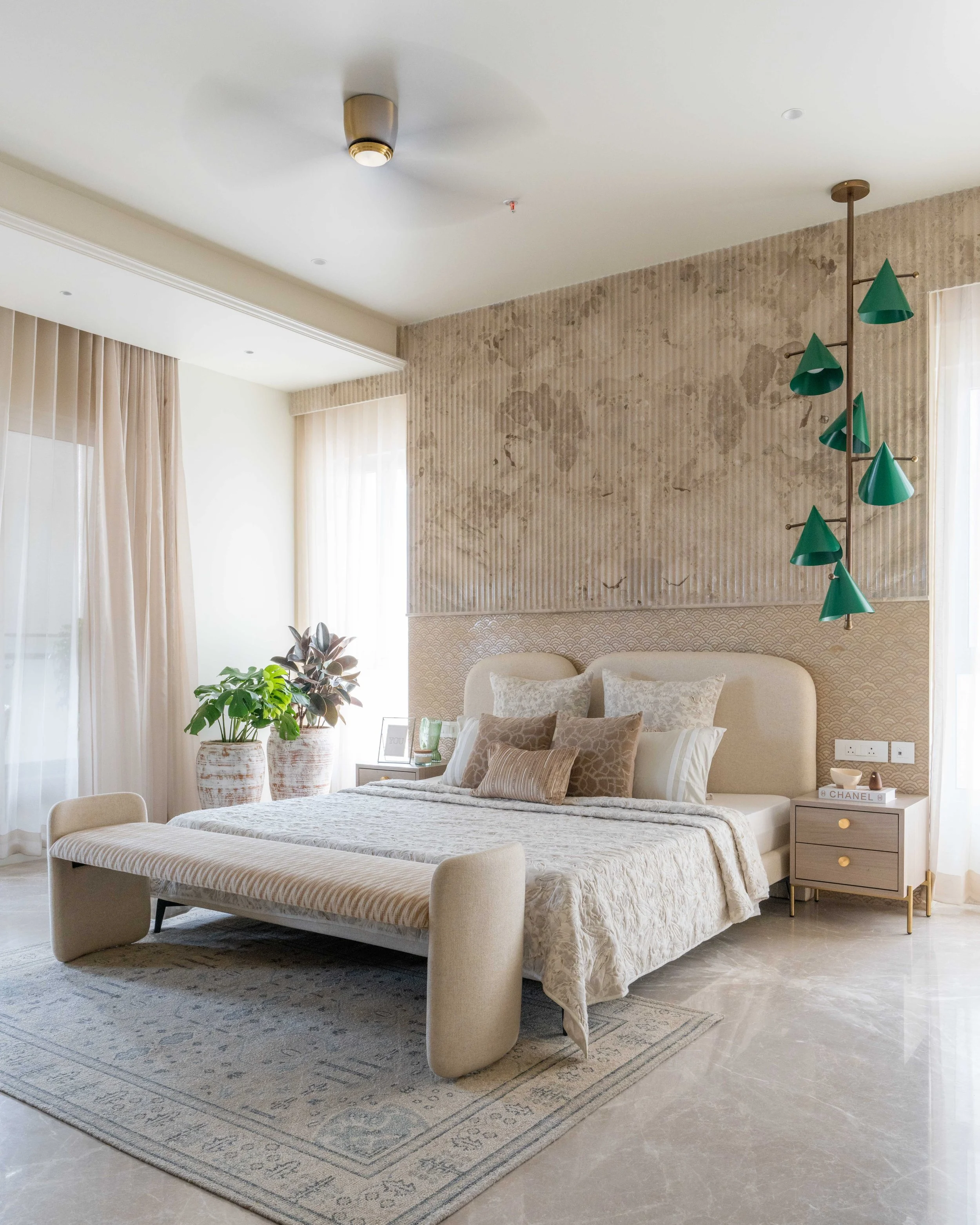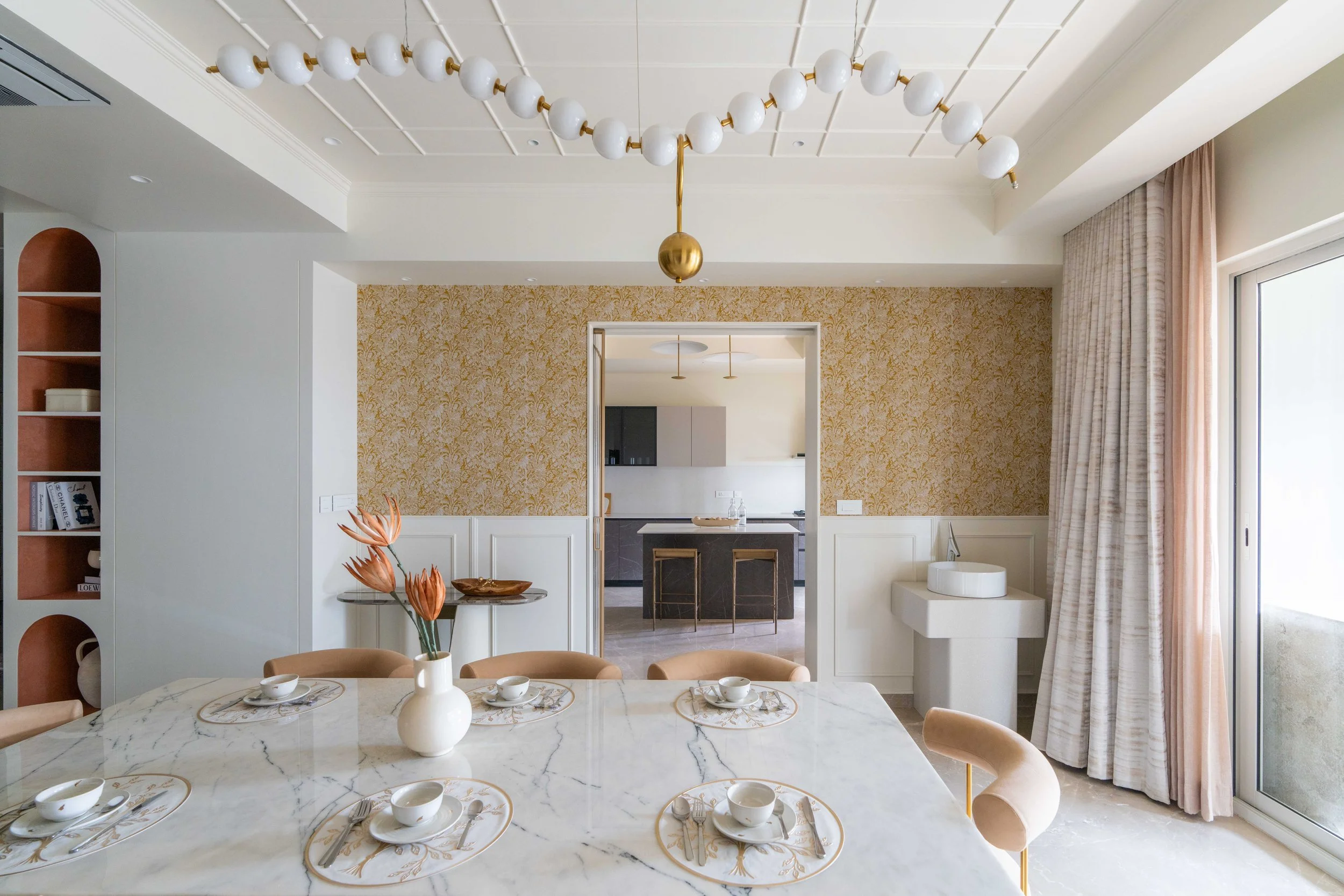 Eternal Glow, as we call it, is a luxury project that comprises two model apartments we designed for Aurobindo Pearl. Rooted in timelessness, much like the pearl itself, the design incorporates elements from different styles and eras, adding visual interest to every space and creating moments of connection for all kinds of visitors. While both apartments are designed to be visually cohesive, each has its own unique take on quiet luxury.