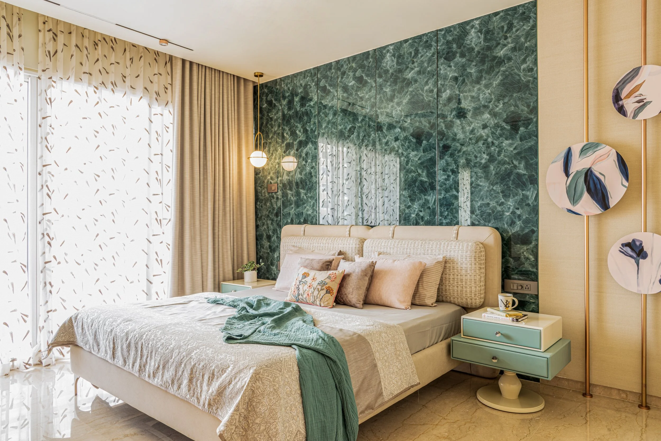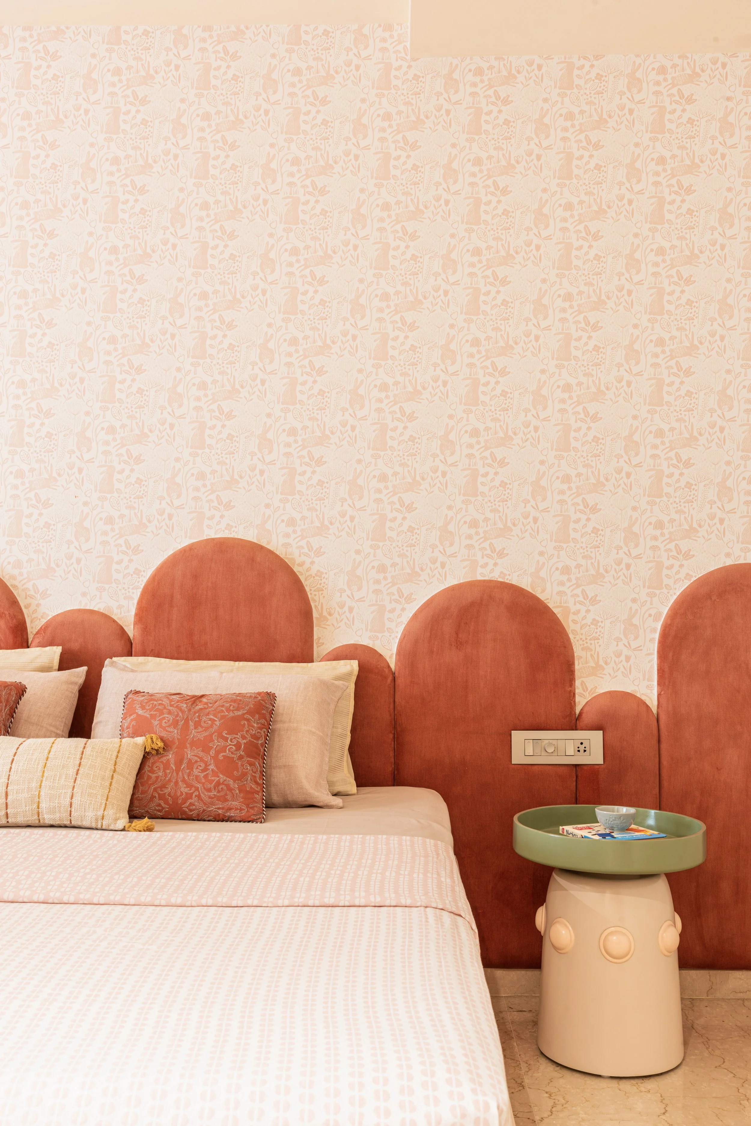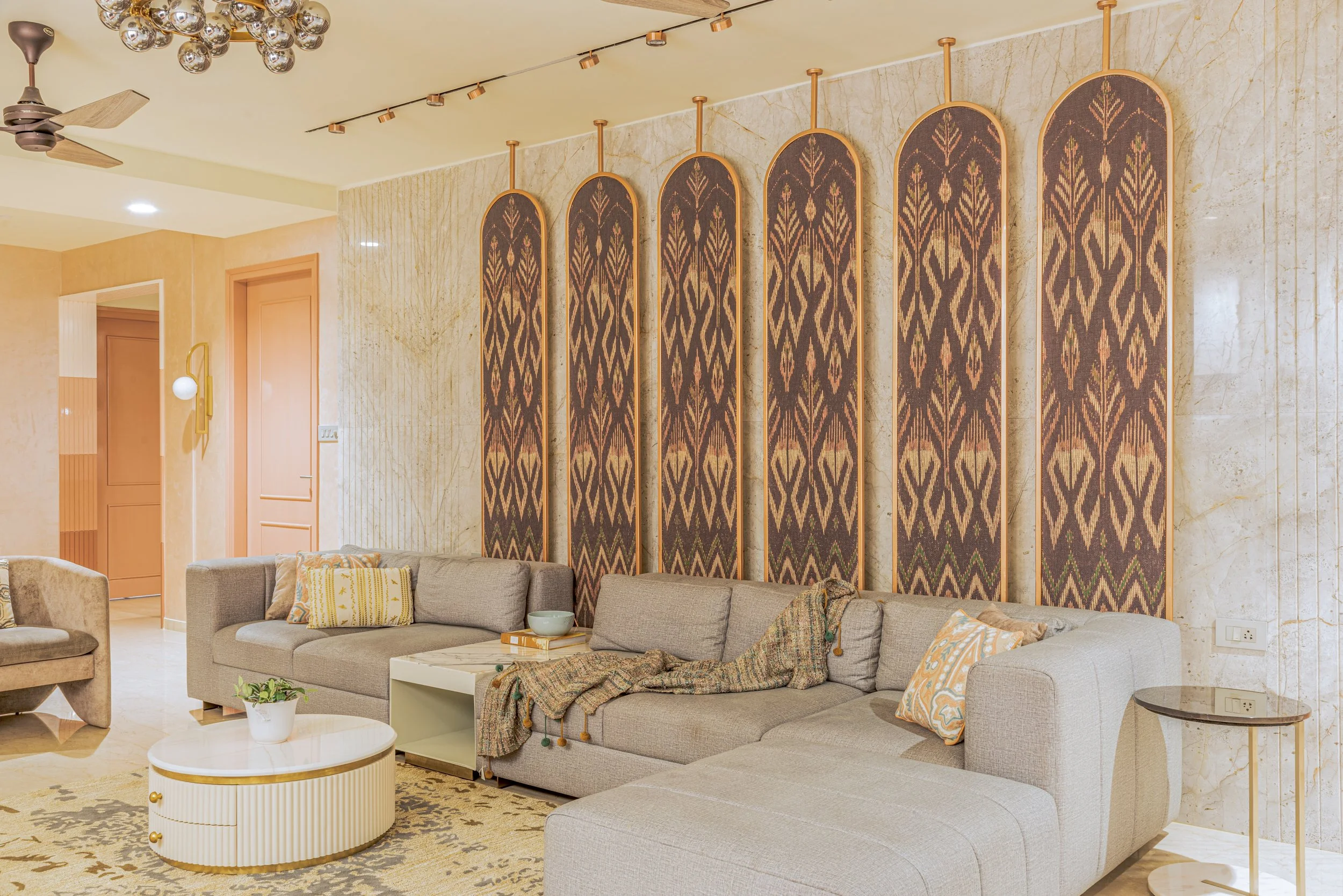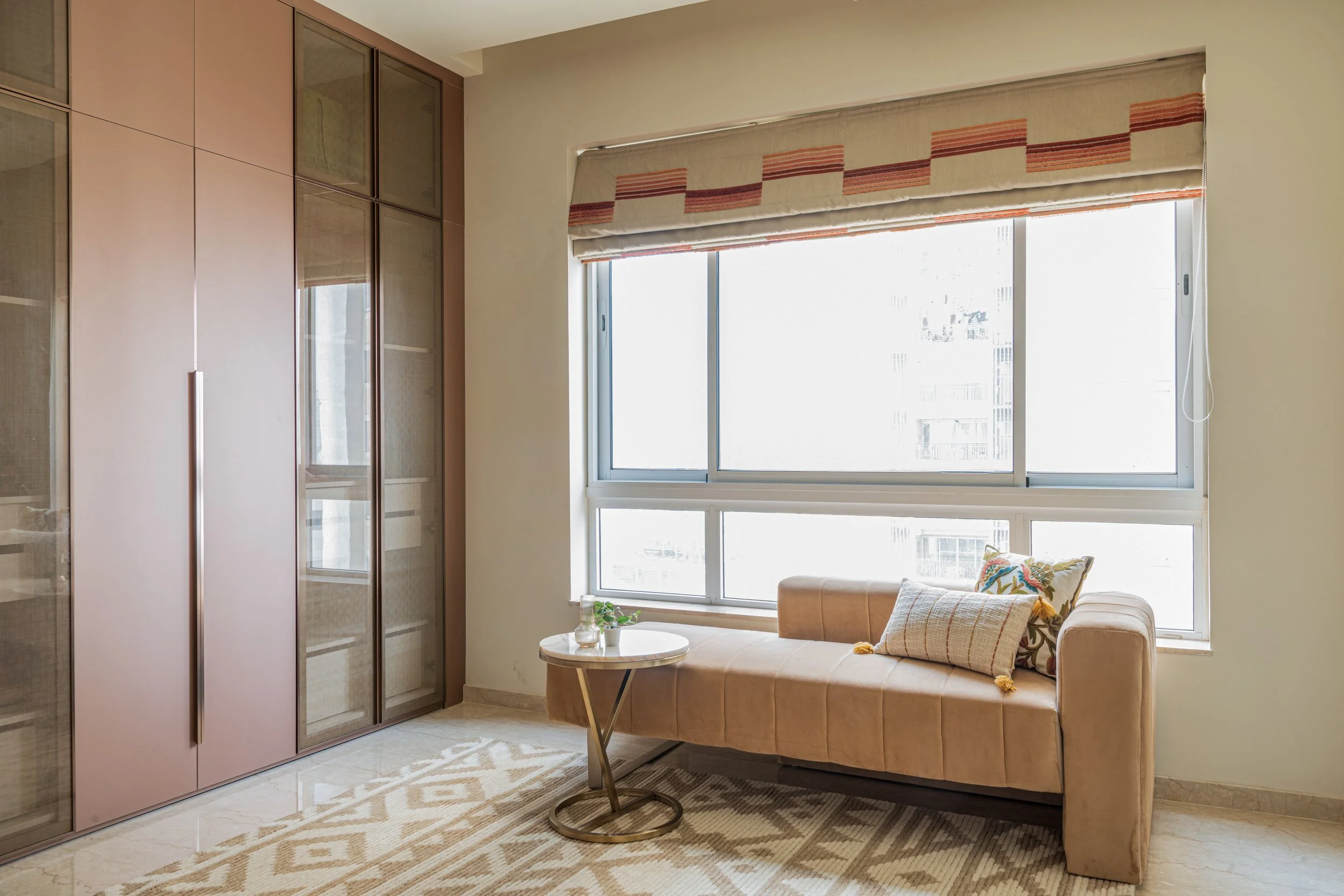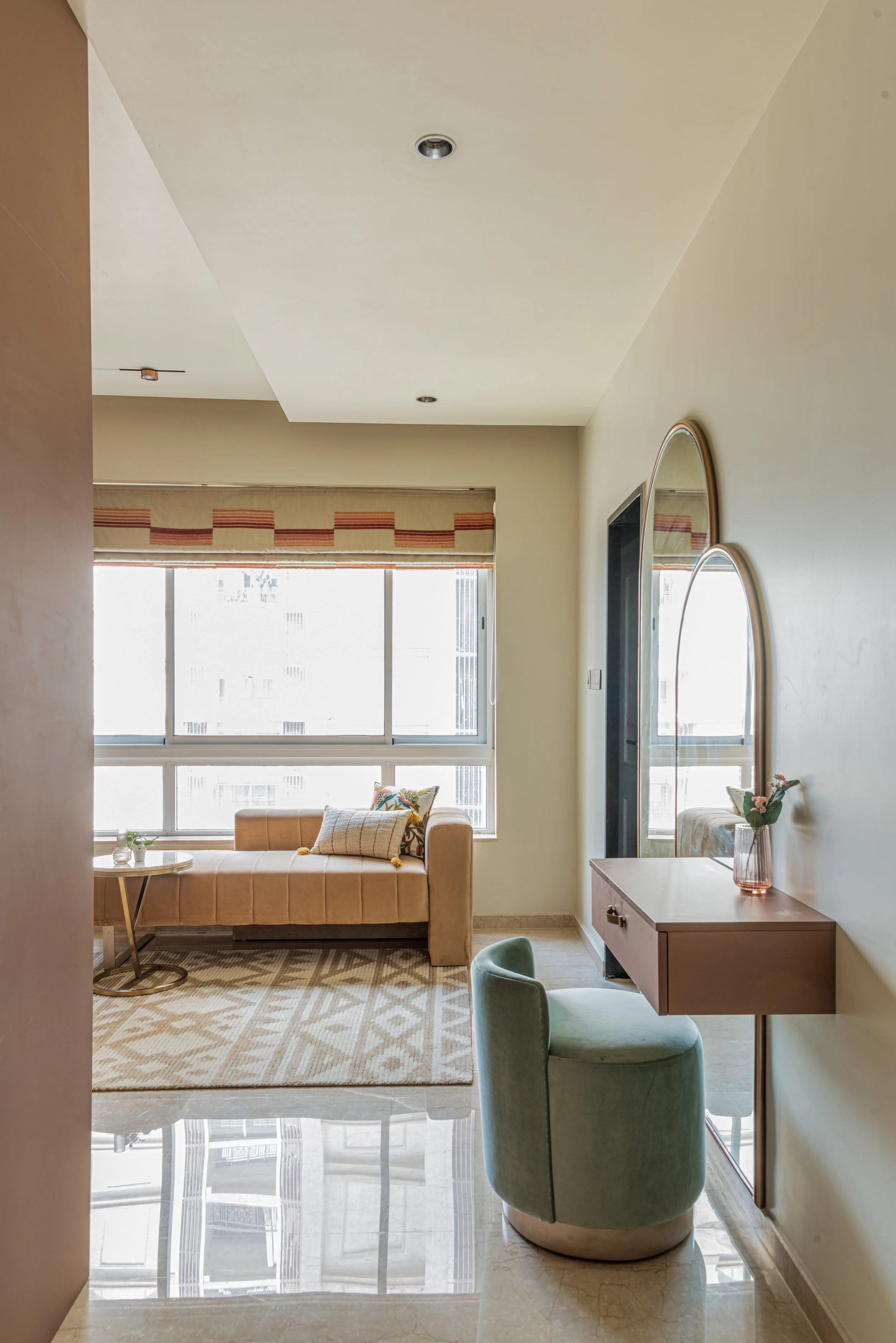 This project is located amidst an ocean of apartments which could sometimes be overwhelming. Hence, the sole objective of the design was to create a sense of calm by visually expanding the space through soft colours and light. The common living area comprises of contrasting textures and large furniture pieces thereby becoming the central anchor point (“vesara”, as we refer to it) for the entire apartment into which all the rooms open.