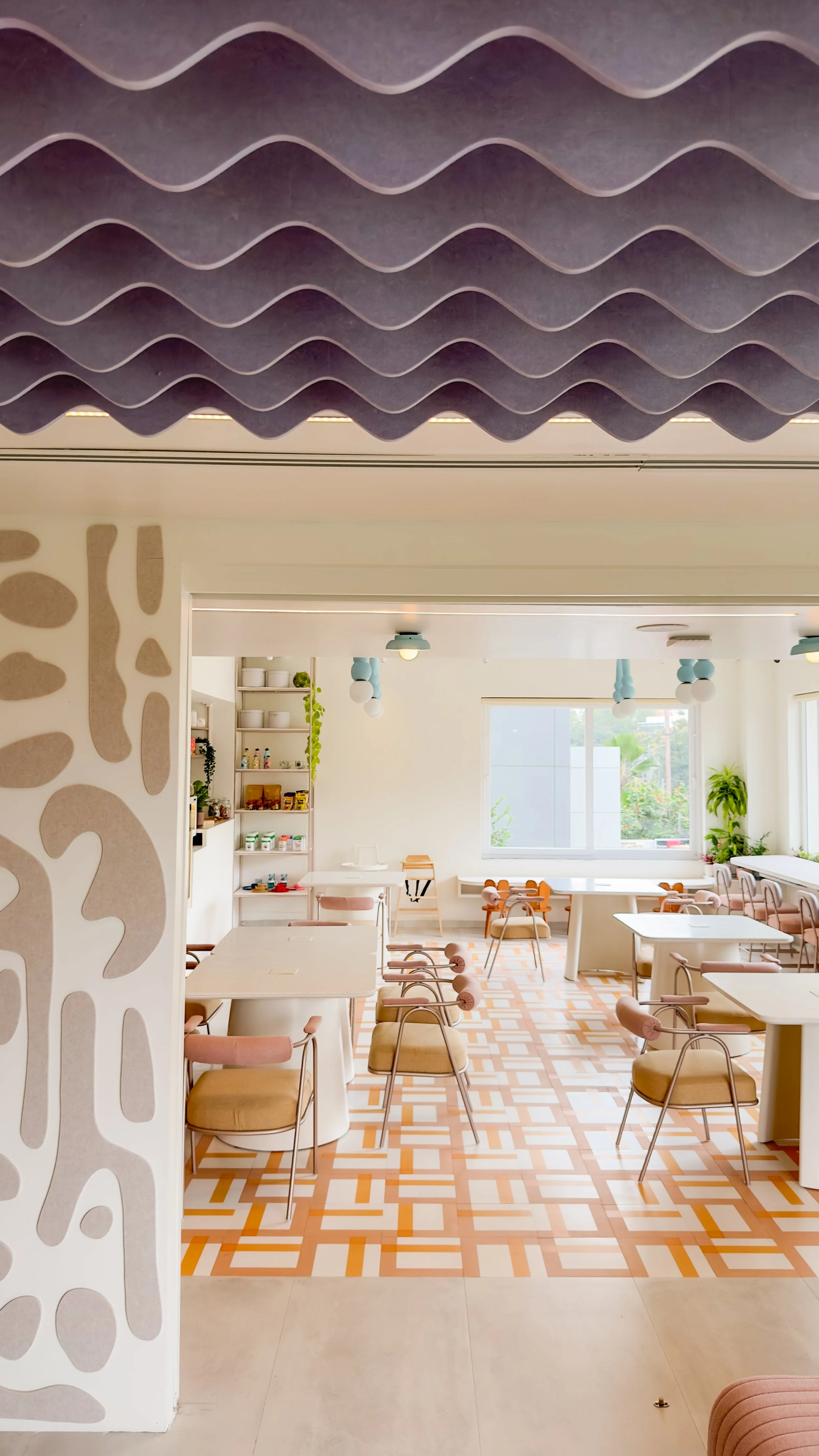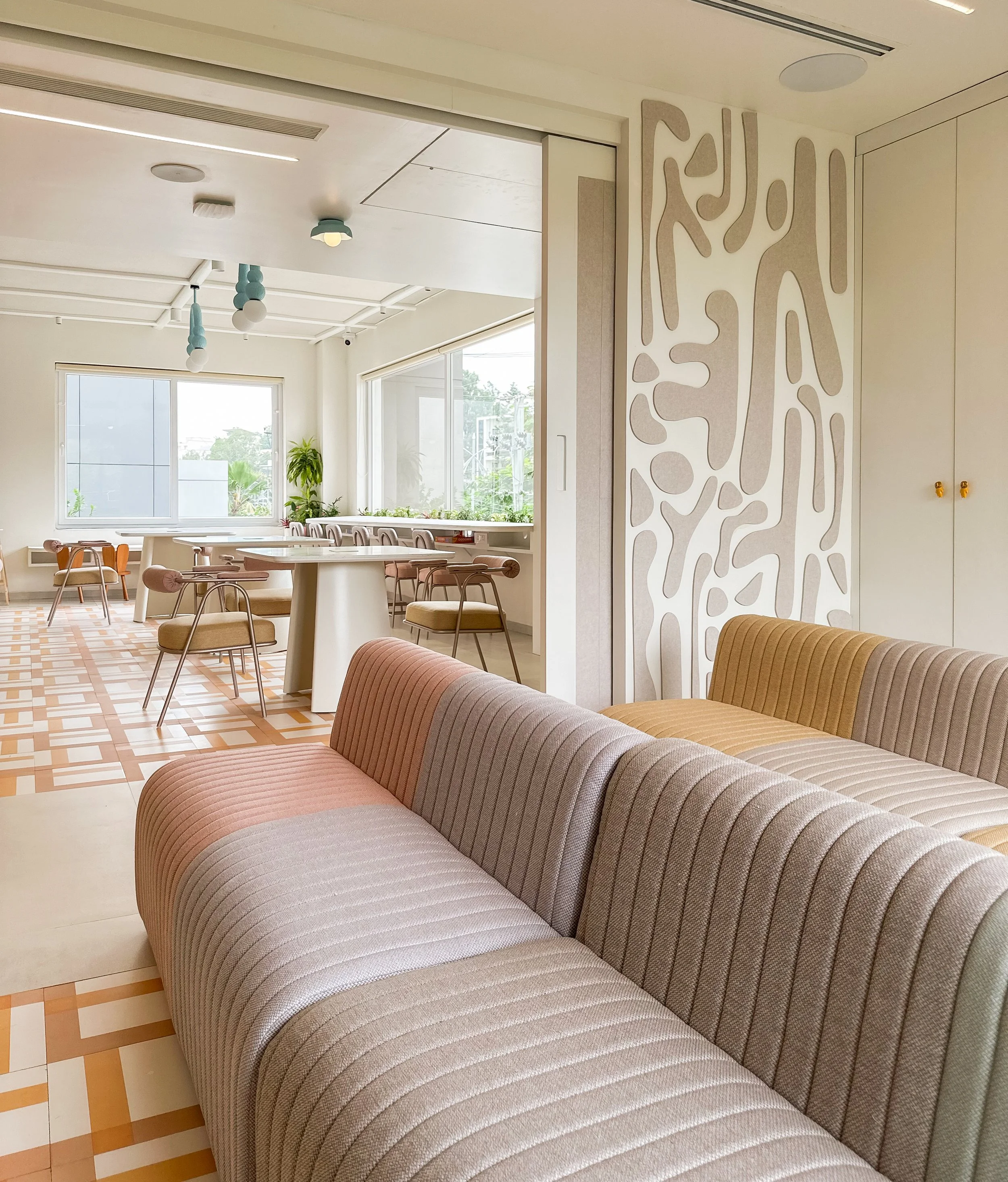 Inspired by the playful minds of children, and their imperfect and irregular drawings, the design of this project strives to create an inspiring environment with abstract forms and energising colours. In different sizes, shapes and colours, this abstract pattern is applied to the floor as tiles, to the walls as acoustic panelling and also translates into other elements such as decorative lights and partitions.